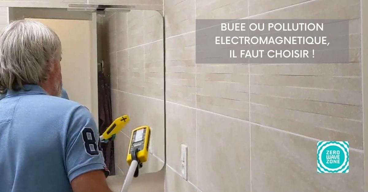 D'ailleurs notre équipement de mesure (NFA1000) s'affole allègrement lorsqu'on l'approche du miroir. Plus de 400 V/m à 40 cm et encore 190 V/m à 1 m, c'est à dire là où vous faites votre toilette et impossible de trouver un champ inférieur à 5 V/m dans toute la salle de bain !